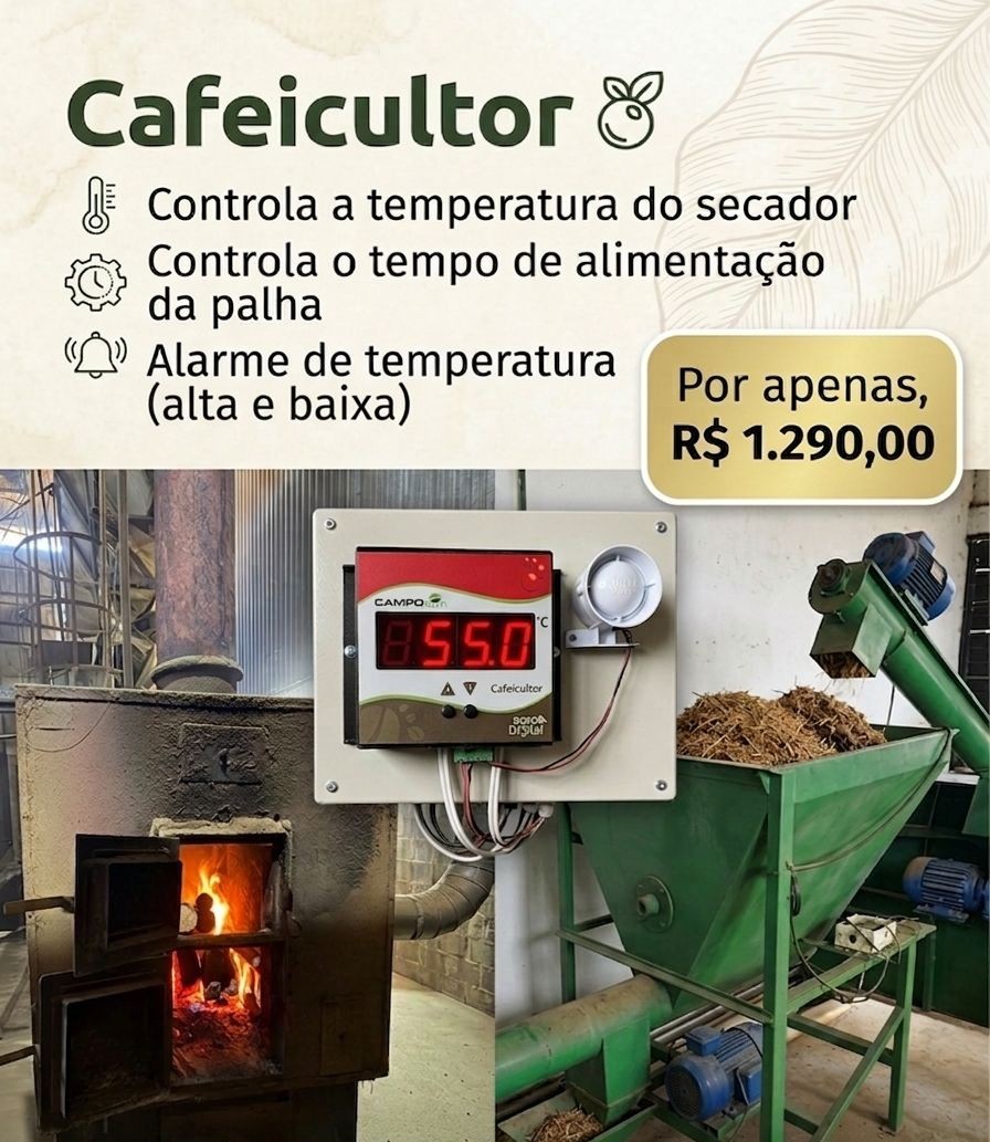 O Cafeicultor é um controlador digital compacto desenvolvido para oferecer mais praticidade, controle e segurança no dia a dia da secagem.