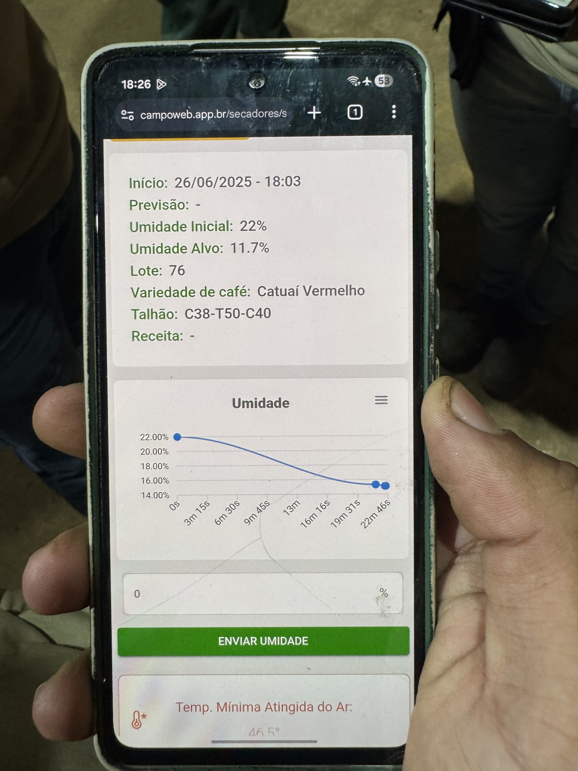 Outro diferencial é a integração com a plataforma CampoWEB, que permite monitoramento remoto e gestão completa da secagem, com acesso a gráficos, relatórios, alarmes e receitas, facilitando a tomada de decisão no dia a dia da operação.